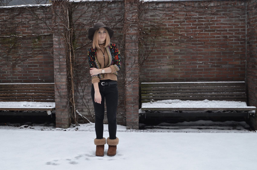 Obviously, for the first snow I got my warm snow boots out of the closet. Warm feet guaranteed. The color of my shoes comes also back in my sweater. To give the outfit some color, I opted for this colorful cardigan. There are various shades of brown in this cardigan, so it makes the perfect combination. Again, a nice hat and I'm ready for the snow. Ok, to be honest, if you are planning to hop around in the snow for a while, you should get a jacket ;)