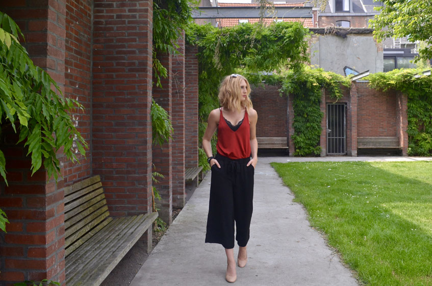 De culottes draag ik echt ontzettend graag en eigenlijk heb ik al spijt dat ik er geen meer heb gekocht in een ander kleurtje. De culottes is het perfecte item voor matig lenteweer met hogere temperaturen maar veel bewolking. In deze outfit heb ik ook wat kleur gebracht met dit rode topje met dunne bandjes. Aangezien ik dat al enige kleuraccent wou, ging ik voor nudekleurige schoenen.