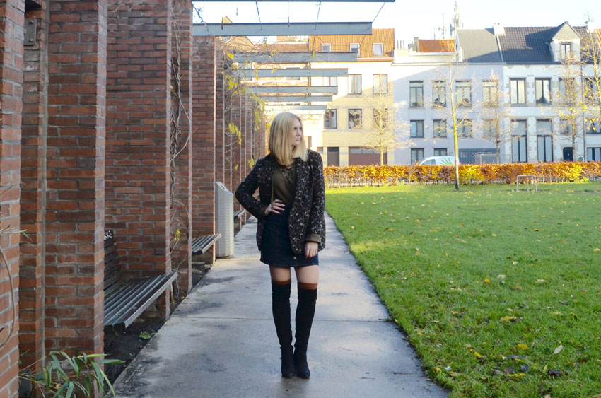 De rok die ik aanheb in deze look, was eigenlijk lichter. Het had een echte jeanskleur, echter ik was de kleur een beetje beu en ik droeg deze rok nog amper. Dus ik besloot deze van kleur te veranderen en zette er een zwart kleurmiddel op, en tadaah daar heb ik dan mijn nieuwe donkerblauwe jeansrok. Een lekker warme trui en jas aan and I'm good to go. Ik koos voor over the knee boots en hoge kousen in plaats van een nylon. Persoonlijk draag ik niet graag nylonkousen en als ik het kan vermijden doe ik het dan ook. Wat vind jij van deze look?